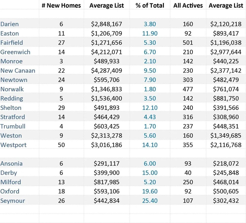 When the media talks about real estate, we hear a lot about new construction starts, or the number of new construction permits being applied for. With that in mind, we gleaned information from our local MLS on the towns we service in Southwestern Connecticut with regards to the amount of new homes the available in each town. The chart below includes only homes that currently on the market within the GFC-CMLS.
